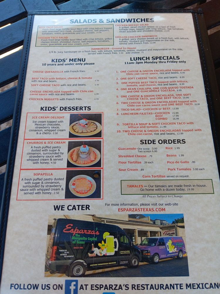 Welcome to Esparza's Restaurante Mexicano, a hidden gem nestled in Grapevine, TX, where Tex-Mex flavors come alive! The menu boasts a variety of mouthwatering specialties, including the Chimichanga, a delightfully stuffed flour tortilla deep-fried to golden perfection, and the Pollo Monterey, featuring grilled chicken topped with creamy Jack cheese and sour cream sauce.