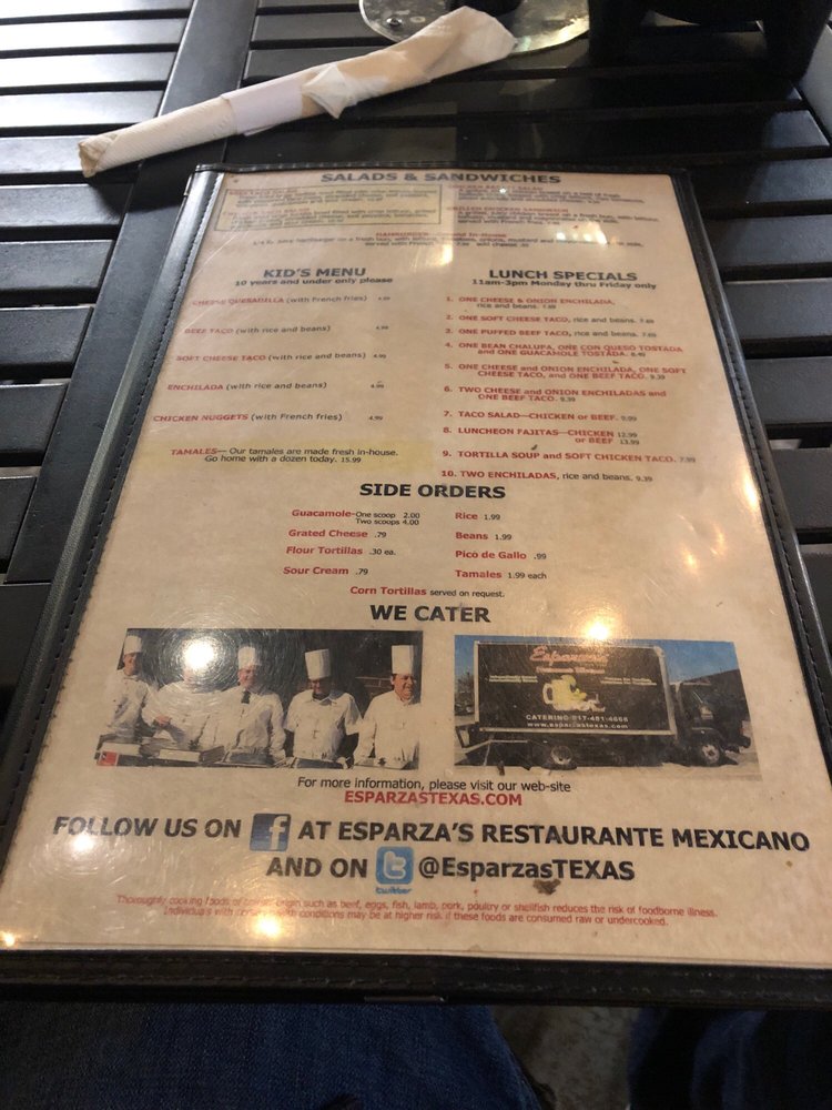 Each dish is crafted from fresh ingredients, promising authentic Tex-Mex goodness. Don't miss the complimentary warm salsa that sets the perfect tone for your meal. Whether you dine in with family or grab takeout, your experience at Esparza's is sure to be filled with warmth, flavor, and friendly service!
